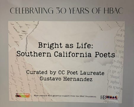 This week I was so excited to have one of my poems included in the Huntington Beach Arts Center’s show Bright As Life: Southern California Poets. The exhibit was curated by Orange County Poet Laureate and poetry dreamboat Gustavo Hernandez. It’s still a little funny to me—and a little exhilarating—to be considered a Southern California poet. I suppose I am, now more than ever, feeling like I have nourishing roots in the soil of Long Beach and a vibrant community that I cherish through the UCLA Extension Writers’ Program.