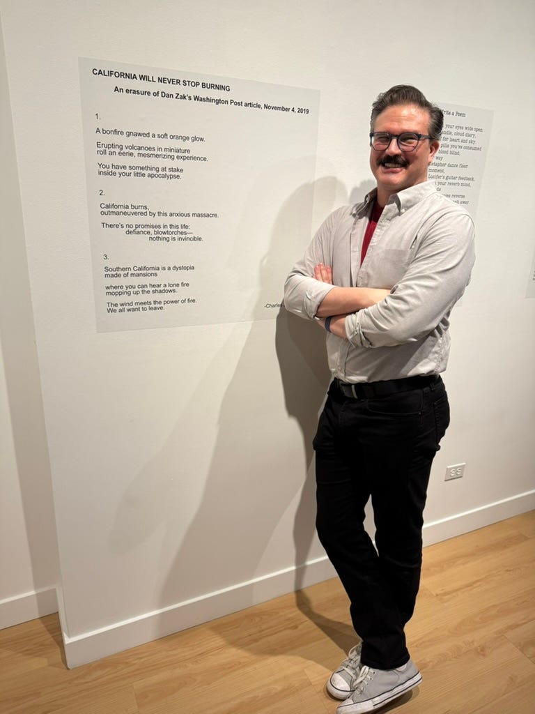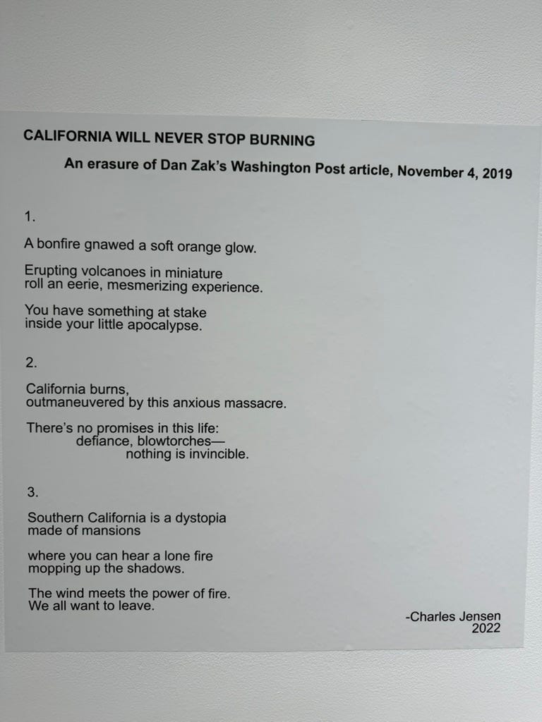I submitted an erasure poem called “California Will Never Stop Burning,” which uses as its source text a Washington Post article of the same name by Dan Zak. That article explores the propensity for wildfire in our landscapes due to the complex intersection of geography, weather, and human settlement. As I read the original text, I sensed some degree of “people ask for this by living in a place they know catches on fire,” which is I think a common enough perspective in our era of climate catastrophe, the same attitude that looks on smugly as homes in the Outer Banks crash into the ocean, or residents of a mobile home community survey the sprinkling of their personal items tracing the path of the tornado that spirited them away. A frustration with that approach was certainly in my heart as I began the poem.